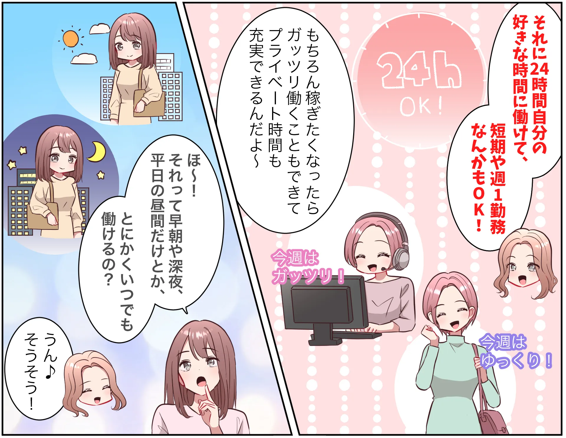 本業の後でも、お買い物の後でも、お好きな時間を使ってください。もちろん長時間のお仕事も可能です。